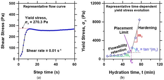 (a) Representative flow curve for a paste showing how yield stress (σy) was determined. (b) Representative time-dependent yield stress evolution of CSA paste, showing the flowability retention regime with slope , the placement limit , acceleration angle , and the hardening regime with slope .