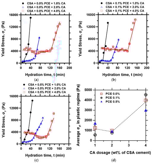 Time-dependent yield stress evolution for CSA cement pastes containing (a) 0% PCE, (b) 0.1% PCE, (c) 0.5% PCE, and (d) average yield stress at the flowability regime as a function of admixture dosage.
