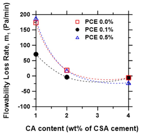 The slope of the flowability regime of the time-dependent yield stress evolution curve (Figure 2b) was used to examine the effect of CA and PCE contents on workability retention. As shown in Figure 4, the slope , which represents the rate of the loss of flowability, decreases monotonously with increasing CA content. The PCE dosage, on the other hand, shows a lesser influence, impacting a slight increase in flowability retention (i.e., decrease in the rate of the loss of flowability) at 0.1% PCE. This effect shrunk with the increasing CA content, which is attributed to competitive adsorption of the citrate over PCE [,,,]. The result suggests that PCE and CA show little or no synergy in improving retention of flowability of the CSA cement pastes, due to the PCE–CA competitive adsorption phenomenon. This is in agreement with literature data wherein PCE is reported to display higher synergy with sodium borate set retarder in improving the flowability of CSA cement pastes compared to CA [,].
