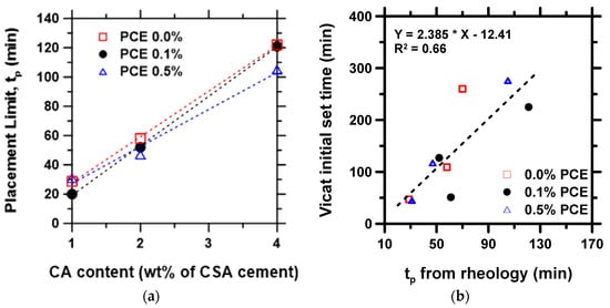 Placement time, , of CSA cement paste: (a) evolution of as a function of admixture dosage, and (b) variation in initial time of set with rheology-based .