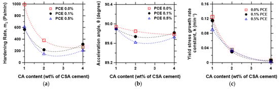 The hardening rate, , of the CSA cement pastes: (a) the evolution of as a function of admixture dosage, (b) the evolution of acceleration angle, , and (c) Yield stress growth rate constant .