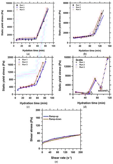 Time-dependent static yield stress evolution obtained with: (a) parallel plate geometry gap of 700 µm, (b) parallel plate geometry gap of 1000 µm, (c) vane rotor and cylinder cup geometry, (d) parallel plate geometry gap of 700 µm accompanied with ex situ re-mixing of pastes at 250 rpm prior to loading sample for each subsequent interval measurement, and (e) representative shear stress—shear rate curve for the ramp-up and -down between 0 and 200 s−1, showing a minimal hysteresis loop below the shear rate of 160 s−1.