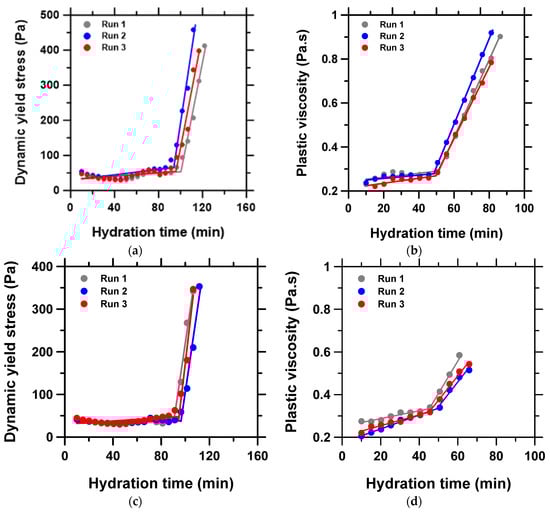 Time-dependent dynamic yield stress and plastic viscosity evolution obtained with: (a,b) parallel plate geometry with a gap of 700 µm, and (c,d) vane rotor and cylinder cup geometry, respectively.