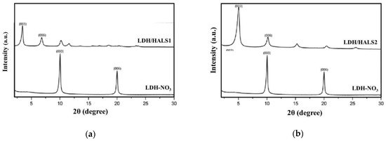 WAXD patterns of (a) LDH-HALS1 and (b) LDH-HALS2 in comparison to the pattern of LDH-NO3.