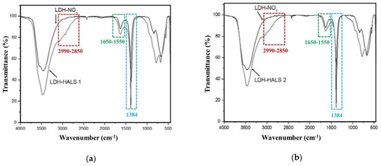 Further confirmation about the presence of HALS1 and HALS2 molecules in LDH structure comes from FTIR analysis, see Figure 3a,b. As expected, due to the presence of HALS molecules, the FTIR spectra of LDH-HALS1 and LDH-HALS2 show different additional absorption bands in comparison to the typical FTIR bands of LDH-NO3. Specifically, the peak at ca. 1560 cm−1 is assigned to the stretching vibration of the carboxylate groups (C=O(O)-) in both HALS1 and HALS2, and this peak is partially overlapped with the peak centered at 1630 cm−1, which is attributed to the bending vibration of crystal water in LDH structure. Broad shoulders/peaks in the range 2990–2850 cm−1 in the spectra of both LDH-HALS1 and LDH-HALS2 can be noticed, and they can be assigned to the C-H stretching vibrations of -CH and -CH3 groups; therefore, confirming the presence of HALS molecules in LDH. Moreover, the absorption bands at 1384 cm−1, due to the stretching vibration of nitrate groups, are clearly visible in the spectra of both LDH-HALS1 and LDH-HALS2, suggesting that the exchange of LDH-NO3 by both HALS 1 and HALS2 occurred partially.