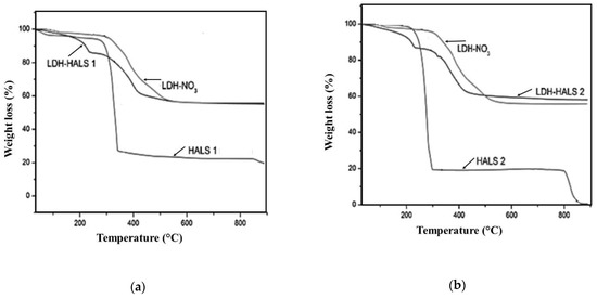 In Figure 4a,b, the TGA curves of LDH-HALS1 and LDH-HALS2 are plotted in comparison to the curve of LDH-NO3. The curve of LDH-NO3 shows a two-step decomposition process: the first weight loss step (weight loss ca. 2.5%), occurs between 100 and 150 °C due to the loss of adsorbed and intercalated water molecules; the second weight loss step (residual weight ca. 55.6%), occurs between 250 and 700 °C due to dehydroxylation of the metal hydroxide layers and the loss of nitrate ions, also according to the literature [5,26].