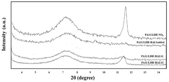 In Figure 6, the XDR traces of all investigated PA11-based nanocomposites are plotted. The PA11-based samples containing LDH-NO3 and LDH/HALSaddded show two well distinguished peaks, i.e., one broad peak at ca. 7° and one at ca. 11.2°, in the range 2θ = 1.5–12°, due to ceramic layered structures. It can be observed that these two peaks appear slightly pronounced in the XRD traces of both the PA11/LDH-HALS1 and PA11/LDH-HALS2 samples, thereby highlighting the existence of disordered LDH structures. This result suggests a beneficial effect on the nanocomposite morphologies of both HALS1 and HALS2 molecules that are anchored onto and between the LDH layers.