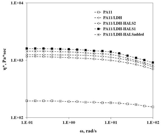 Viscosity curves (η*) of neat PA11 and all investigated PA11-based nanocomposites.