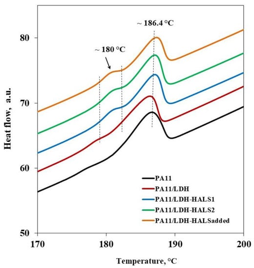 Figure 8 and Table 1 show the results from the DSC analysis of neat PA11 and all investigated PA11-based nanocomposites. Neat PA11 shows a clearly visible main fusion peak at ca. 186.4 °C due to the presence of the α-crystalline form, and a shoulder at ca. 180 °C due to the presence of the γ-crystalline form, in accordance with the literature [6]. As can be seen, the presence of LDH makes the shoulder at ca. 180 °C more pronounced, suggesting the incrementation of the PA11 γ-crystalline form; this effect was documented in the literature for other ceramic nanoparticles such as montmorillonite [6,27]. As is shown in Table 1, due to the presence of LDH both Tm1 and Tm2 are slightly lower in comparison to the melting temperatures of neat PA11, and the results are slightly higher due to the presence of all kinds of LDH-HALS. Considering the values of fusion enthalpy from the first heating scan, it seems that unmodified and modified LDH exert a slight nucleating effect that is not noticeable in the second heating scan. This is because the LDH presence limits the macromolecules’ organization in regular structures., The short experimental time should also be taken into consideration here.