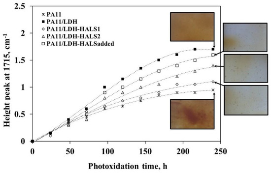 Figure 9 shows the increace in peak height of 1715 cm−1 as a function of photo-oxidation time of neat PA11 and all investigated PA11-based nanocomposites, while all acquired FTIR spectra are reported as Supplementary Information, see Figures S1–S5. The presence of LDH in PA11 causes a significant increase to the peak high of 1715 cm−1 in comparison to neat PA11 at same exposure time. Interestingly, this peak is less pronounced for samples containing LDH/HALSadded, and even more for samples containing both LDH-HALS1 and LDH-HALS2. As expected, the presence of free added HALS molecules, especially anchored HALS1 and HALS2, cause the appearance of a less pronounced peak of 1715 cm−1; thereby, suggesting an improved photo-oxidative resistance in these nanocomposite films. Further confirmation comes from the visual inspections of all investigated samples at maximum exposure time, see images reported in Figure 9. Neat PA11 and PA11/LDH show significant yellowing (yellow to brown colour), while the samples containing stabilizing molecules appear to show only small yellow spots.