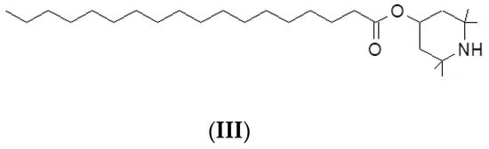 The Hindered Amine Light Stabilizer, HALS, (UV, molecular weight of 423.72 g/mol; C27H53NO2) is 2,2,6,6-Tetramethyl-4-piperidinyl stearate from Cytec® (Cyasorb® UV-3853), see (III) in Scheme 1.
