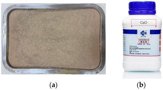 The soil used in the test was exfoliated soil from a soil site in Henan Province (Figure 1a). The soil was silty clay, with a liquid limit of 32%, plastic limit of 14%, and plasticity index of 18. The chemical element composition of soil samples was analyzed by XRF test, and the results are shown in Table 1. High active CaO was used for lime soil preparation, with particle size of 150–200 mesh and a white appearance (Figure 1b). The chemical composition of lime is shown in Table 2.