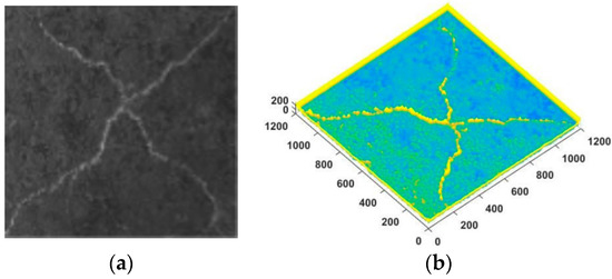 Crack image processing and information extraction: In order to reduce the influence of sample boundary, the middle part of the sample (size 20 × 20 cm2) was used for quantitative fracture analysis. Firstly, Image–pro plus6.0, Adobe PhotoShop, and other software were used to cut the image, correct the size, and remove the lime efflorescence interface. Then, MATLAB software (MATLAB 7.0) was used to compile the program for extracting the characteristic parameters of three-dimensional volumetric fracture rate, and the method of integration was used to solve the volume fracture rate of the sample through the three-dimensional level [26,27]. Figure 3 shows a processed three-dimensional image. Equation (1) is the volume crack rate of soil mass.