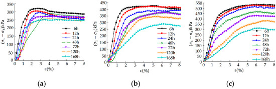 Stress–strain curves of samples under different aging time and confining pressures: (a) = 50 kPa; (b) = 100 kPa; (c) = 150 kPa.