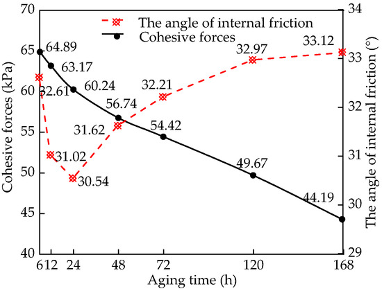 Variation law of cohesion and internal friction angle of samples with different aging time.