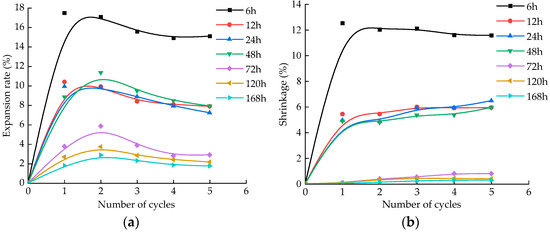 Figure 6 shows the relationship between aging time, number of cycles, and expansion shrinkage rate after five dry–wet cycles. The expansion rate of the sample decreases with the increase in aging time (Figure 7a). When the aging time is 72 h, the expansion rate decreases to 4%. If the aging time is prolonged, then the change trend of the expansion rate is not obvious, and the change rate is about 1–2%. The expansion rate of the sample reaches a peak after one or two dry–wet cycles, and then decreases gradually with the increase in the number of dry–wet cycles. During the first dry and wet cycle, lime soil and water undergo a hydration reaction to produce expansion. If the first hydration reaction is insufficient, the second dry and wet cycle soil sample continues to undergo the hydration reaction. As the hydration reaction continues, the sample starts to expand and crack, the internal damage of the soil is serious, and the expansion rate gradually decreases.