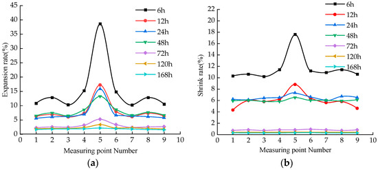 Samples with different aging times at 9 different fulcrums: (a) expansion rate; shrink rate; (b) shrink rate.