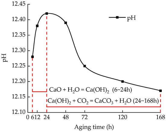 - The content of Ca(OH)2 increases first, and then decreases with the extension of the aging time, and a peak value is obtained at 24 h. The change in the Ca(OH)2 content tends to remain stable at 72 h of aging, and even after the aging time is prolonged. The overall decrease trend is not obvious, and the change in Ca(OH)2 content is about 1.4–1.8%. The change trend of the pH value is consistent with that of Ca(OH)2.