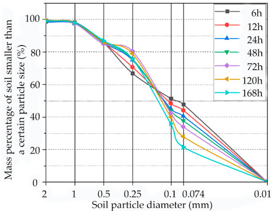 The content of each particle size of samples with different aging times is shown in Figure 10. With the increase in aging time, the content of particles smaller than 0.1 mm decreases, and the content of particles smaller than 0.1–0.5 mm increases. Compared with the sample aged for 72 h, the content of fine particles less than 0.1 mm decreases by 17.5%, and the content of particles of size 0.1–0.5 mm increases by 23.7%. In the aging process, lime and soil particles react chemically, and obvious agglomeration effects occur. Small particles are cemented together to form large particles, and a relatively stable bond is formed between particles [33,34].