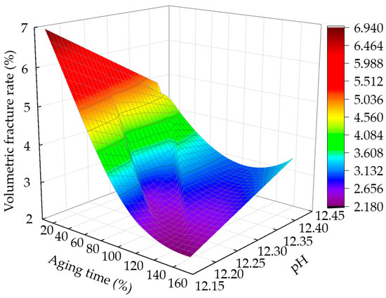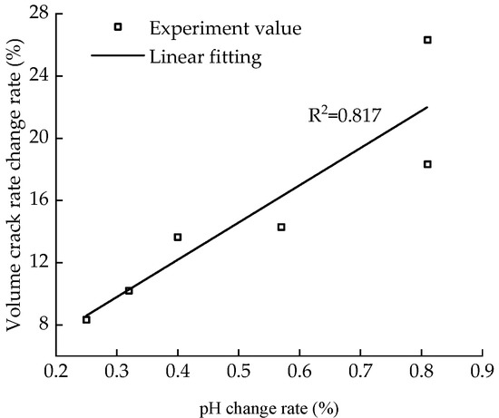 Figure 11 shows the variation curve of the volume crack rate with aging time and pH after five dry–wet cycles. At the initial stage of aging, the pH of the sample is low, and the volume crack rate is high. As the aging time increases, the pH first increases and then decreases, and the volume fracture rate decreases. Figure 12 shows the fitted curve of the correlation between pH change rate and volume fracture rate change; it is observed that there is a good, linear, positive correlation between the volume fracture rate and pH within a certain time, with a correlation value of 0.817. With the increase in pH change rate, the amount of Ca(OH)2 produced by the CaO hydration reaction increases, and the volume crack rate resulting from the secondary hydration reaction decreases.