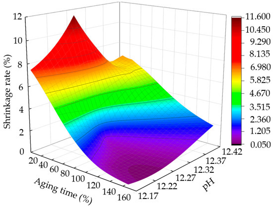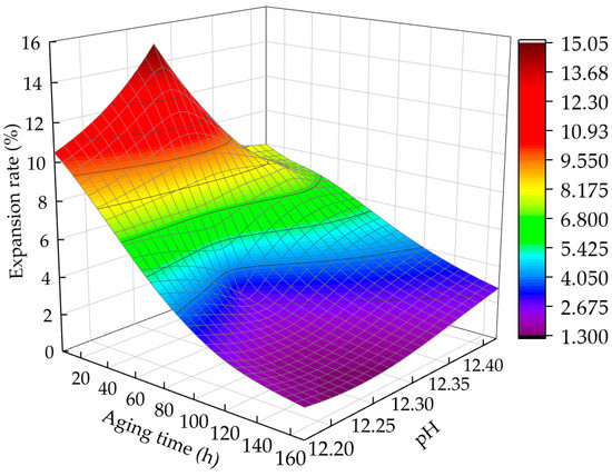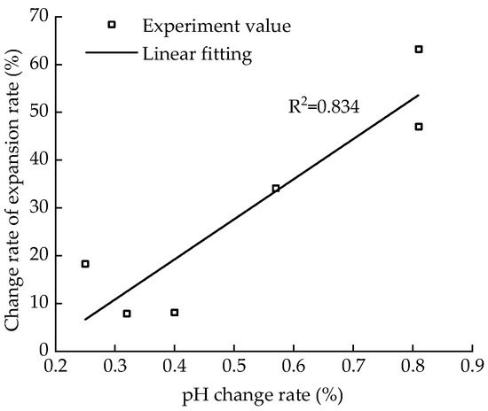 Figure 14 shows the fitted curve of the correlation between the change rate of the pH value and that of the expansion rate. Given a certain aging time, the correlation between the change rate of the pH and decrease in expansion rate is very high, with a good linear relationship. When the aging time is 6–72 h, the change rate of pH is large, the change rate of Ca(OH)2 is accelerated, and the expansion rate is reduced.