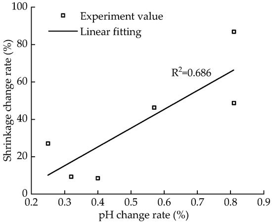 The shrinkage of the sample reflects its water-holding capacity. Figure 15 shows the change curve for shrinkage with aging time and pH after five dry–wet cycles. With the increase in aging time, the pH first increases and then decreases, and the shrinkage continues to decrease. Figure 16 shows the fitted curve of the correlation between the change rate of pH and that of shrinkage, with a good, linear, positive correlation between the shrinkage and pH for a certain aging time. When the aging time is short, the pH value is low, expansion cracking occurs after the secondary hydration reaction of the sample, the internal damage of the soil is serious, the water-holding capacity of the sample is poor, and the shrinkage rate is large [35,36].