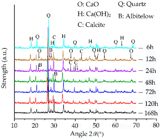 During aging, the change in the pH value of the sample is closely related to the amount of Ca(OH)2 produced by the CaO hydration reaction. To further explore the internal mechanism of the effect of the pH value on lime soil cracking under different aging times, seven sets of samples with different aging times were selected for the XRD test to explore the formation and change law of the internal products of the samples. Figure 17 shows the XRD results, analysis of which shows that lime soil contains CaO, Ca(OH)2, CaCO3 crystals, and other substances. Quantitative analysis of the XRD results is carried out, and the analysis results are shown in Figure 18. The following results are obtained by analysis: