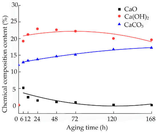 - In the aging process, the content of CaO decreases with the increase in aging time. When the aging time is 6 h, a large amount of the CaO reacts with water quickly to form Ca(OH)2, and the content of CaO decreases to 5.2%. When the aging time is extended to 72 h, the content of CaO decreases to 0.8%. If the aging time is extended further, the overall decreasing trend is not obvious, and the content changes remain within 0.05–0.73%;