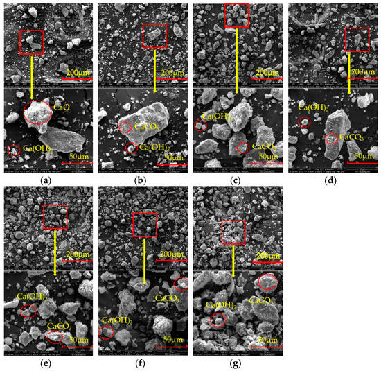 - Figure 15 shows the XRD analysis results of soil samples with different aging times. The changes in material composition of soil samples with different aging times can be obtained by XRD. The peak points of the chemical substances of the soil samples at different aging times change. With the increase in aging time, the peak intensity of CaO decreases, but the peak intensity of Ca(OH)2 increases first, and then decreases. The CaO hydration reaction generates Ca(OH)2, which leads to the increase in the peak intensity of Ca(OH)2. Affected by carbonization reaction, Ca(OH)2 reacts with CO2 in the air, so that the peak intensity of Ca(OH)2 decreases, and the peak intensity of CaCO3 gradually increases. However, the diffraction peak intensity of the CaCO3 crystals is low, the content of CO2 in natural air is low, the carbonization reaction is slow, and the final carbonization products are limited [37,38];