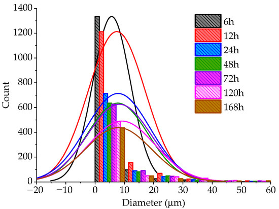 We further studied the particle size change of the particles, conducted contrast and denoising on the electron microscope images using Photoshop software, and then measured the particle size using Image Pro Plus 6.0 software to obtain the particle size of the particles in different aging times under the micro state. Figure 20 is a normal distribution diagram of particle size at different aging times.