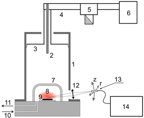 Block-scheme of the CVD reactor: 1—a wall of the microwave resonator; 2—adjustable communication device based on a coaxial waveguide; 3—the upper movable wall of the resonator; 4—rectangular waveguide; 5—circulator; 6—magnetron; 7—quartz flask; 8—plasma; 9—silicon substrate; 10—supply of the gas mixture; 11—pumping out; 12—focusing lens; 13—movable light guide; 14—HORIBA Jobin Yvon FHR-1000 spectrometer.