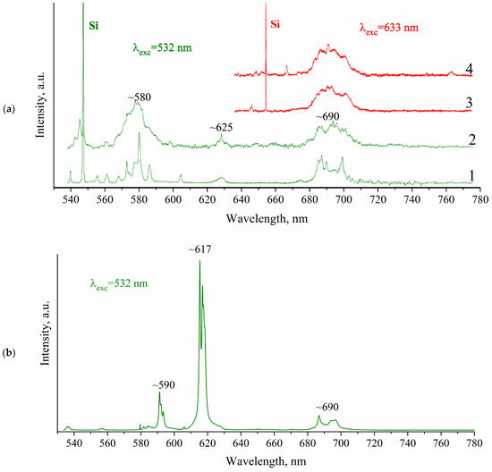 It is noteworthy that excitation at 633 nm leads to Eu3+ emissions in the region of 680–710 nm regardless of any area being excited and its color. This photoluminescence band is assigned to 5D0→7F4 of Eu3+ as stated, for instance, by V. Sedov et al. [6].