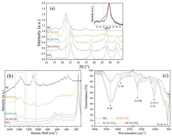 (a) XRD patterns of (–) NC, (–) TiO2, (–) NC80-TiO2, (–) NC20-TiO2, and (–) NC10–TiO2 nanocomposites. The inset shows a comparison between the (101) peak of TiO2 and NC20–TiO2; (b) µ- Raman spectra and (c) FTIR spectra for nanocellulose (NC) and NC–TiO2 nanocomposites.