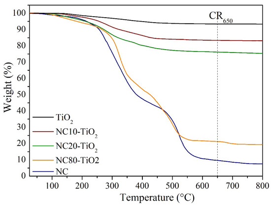 Thermogravimetric analysis (Figure 2) was carried out to obtain information on the thermal stability of the synthesized NC–TiO2 nanocomposites. TG curves of TiO2 and NC were also reported for comparison. The NC–TiO2 nanocomposites decomposed at a relatively higher temperature than NC (Figure 2). As expected, the TG curve of TiO2 showed a small weight loss of about 2% in the range 105–250 °C, related to the total content of residual water, acetic acid, and some organic groups deriving from the synthetic procedure. In the case of the NC10–TiO2, the TG curve showed an initial weight loss of about 5% up to 130 °C caused by the removal of physically absorbed water, followed by a second weight loss step of 16.8% in the 130–520 °C range, attributed to the burning of the carbon species in the nanocomposites. Further, there was no significant weight loss observed above 520 °C, and an RC650 of about 84% remained. A similar trend was observed also for the NC20–TiO2 except that for the lower RC650 of about 76% at 650 °C. Contrarily, the NC80–TiO2 followed a thermal degradation path similar to that of the NC, with two distinct steps of decomposition. The first step between 215° and 400 °C with a weight loss of 39% could be attributed to the reactions of dehydration and decarboxylation of the NC that produced the combustion gases, such as levoglucosan [33]. The second step in the range of 400–580 °C with RC650 ≈ 21% was the oxidative decomposition of the char formed from the first step [23,34]. In all cases, the residue was the inorganic component of TiO2, so we can infer the TiO2 content was about 84, 76, and 21 by wt. % for NC10–TiO2, NC20–TiO2, and NC80–TiO2, respectively.