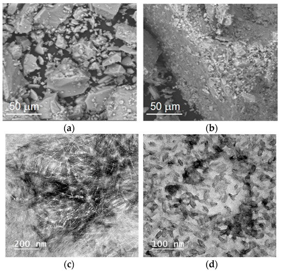 The morphology of pure TiO2 and NC–TiO2 was studied by SEM, and the corresponding images were reported in Figure 3a,b. TiO2 is composed of large sheet-like aggregates, heterogeneous in size (Figure 3a). The NC–TiO2 composites had very similar morphologies as a result of the aggregation of several thousands of nanoparticles whose final size decreased slightly upon increasing the amount of nanocellulose (Figure 3b). The TEM image (Figure 3c) showed that the NC had nanosized rod-shaped whiskers, bunched together into a tendon-like structure, with an average NC width and length of about 6.2 ± 0.96 nm and 39.4 ± 8.68 nm, respectively. The NC–TiO2 nanocomposites had instead a granular shape (Figure 3d), with the TiO2 covering the surface of the NC. Moreover, the TiO2 particles not only covered the surface but also deposited on the pores of NC.