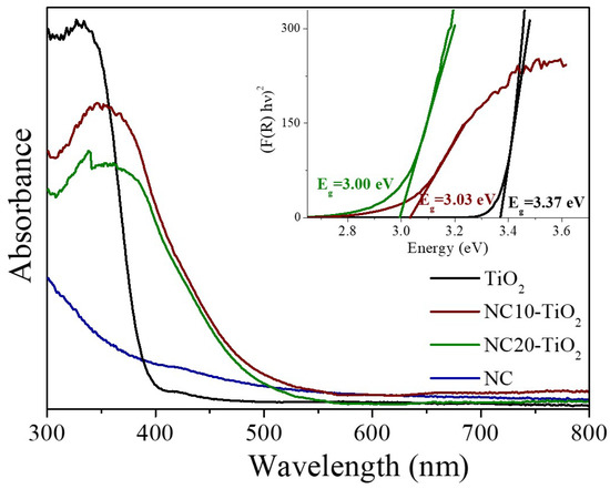 The optical properties of NC–TiO2 nanocomposites were investigated by UV–vis diffuse reflectance spectroscopy (Figure 4). The UV absorption spectra of the NC–TiO2 nanocomposites resembled that of pure TiO2, with the maximum UV absorption redshifted from 330 nm to 360 nm. The observed shift for the nanocomposites could be indicative of the chemical interactions of TiO2 NPs with the large molecular framework of the nanocellulose. The NCT nanocomposites also showed a certain level of visible light absorption, which, in general, could be associated with a decrease in the band gap following the formation of the NC–TiO2 hybrid nanocomposites [13,37]. The corresponding band gap values were obtained by plotting the Kubelka–Munk function against the photon energy (inset in Figure 4). Pure TiO2 showed a band gap of 3.37 eV, very close to the reported value for bulk TiO2 (3.40 eV). The band gap values of NCT nanocomposites were very similar and sensibly lower than that found for the pureTiO2 (Eg = 3.00 and Eg = 3.03 eV for NC10–TiO2 and NC20–TiO2, respectively). This result confirmed the bonding interactions between NC and TiO2 after the formation of the NC–TiO2 nanocomposites, and they were directly correlated to the observed absorption of visible radiation.