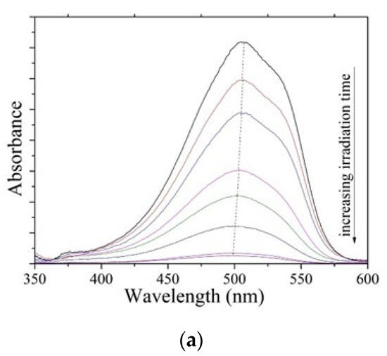 Photodegradation tests were carried out in the presence of NC–TiO2 nanocomposite powders dispersed in 50 mL of aqueous solution with an initial MO concentration of 25 ppm at pH = 2. The pH of the solution was adjusted before irradiation, and it was not controlled during the course of the reaction. The residual concentration of the organic dye was followed by UV–vis spectroscopy monitoring the variation of absorbance at its λmax. Figure 5a showed the evolution of MO absorbance during the photocatalytic experiment. The MO absorption spectrum had a maximum at λ = 507 nm corresponding to the π→π* transitions of the dimethylamino electron donors. A progressive decrease in the π→π* MO absorption peak with the increasing irradiation time and a corresponding blue-shift during the kinetic experiments were observed, which confirmed the degradation of the dye associated with the removal of the N-methyl groups [38].