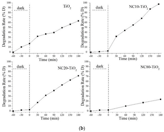 Figure 5b showed the degradation rates of MO by NC–TiO2 nanocomposites under UV light. Before UV irradiation, solutions containing the nanocomposites were stirred for 60 min in the dark at room temperature to establish the adsorption–desorption equilibrium. Apart from pure TiO2, none of the nanocomposites showed noticeable absorption phenomena. During the first stage, indeed, it was observed that 17.5%, 2%, 2.5%, and 1.3% MO were absorbed for pure TiO2, NC10–TiO2, NC20–TiO2, and NC80–TiO2, respectively, indicating that the absorption had negligible effects on the removal of MO in the case of the NCT composites.