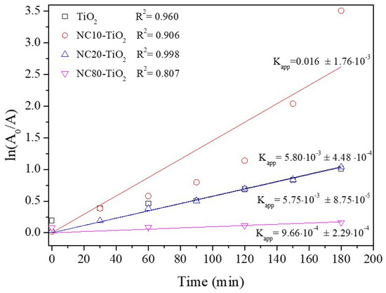 The kinetics of the MO photodegradation was described by using the pseudo-first-order model ln(C0/C) = kappt, where C0 is the initial concentration of MO and kapp is the apparent rate constant. The kinetic and regression constants are reported in Figure 6. The NC10–TiO2 had the highest reaction rate constant (kapp = 0.016 min−1), about four times higher than that of bare TiO2, thus confirming the best degradation efficiency, suggesting that low amounts of nanocellulose had beneficial effects on the degradation efficiency of the corresponding NC–TiO2 nanocomposites. This result was in contrast with those reported in some cases, as in Ref. [39], according to which the efficiency in mefenamic acid (MEF) degradation decreased by increasing the TiO2 content in the NC–TiO2 nanocomposites. These differences suggest that not only the amount of NC in the nanocomposites affected the photodegradation activity but also the NC–TiO2 intrinsic chemical structure. In the present study, the observed behavior could be explained by considering the intrinsically different amounts of hydroxyl groups available at the surface of the catalyst particles. As already known, the species responsible for photodegradation of dyes in water were hydroxyl radicals, •OH, and anion radical superoxides, •. Hydroxyl radicals were produced by the photogenerated holes (h+) in the conduction band from the direct oxidation of H2O, OH− ions, or terminal –OH groups on the surface of the catalyst. In this respect, NC–TiO2 nanocomposites with low amounts of NC provided a large number of hydroxyl groups on the catalyst surface, as evidenced by the FTIR results, which could promptly react with h+, locally producing •OH radicals, which degraded the organic dyes in solution and reduced the electron-hole recombination responsible for the decrease in photocatalytic activity.