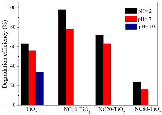 Percentages of the degradation efficiency for methyl orange obtained with different NC–TiO2 nanocomposites and TiO2 at different pH values.