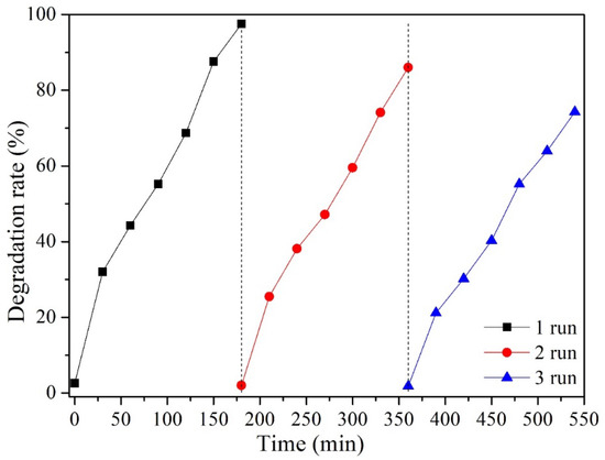 The results were reported in Figure 8: after three times of repeated use, the degradation rate decreased from 98% to 75%, which could be attributed mainly to the inevitable loss of small amounts of photo-active material after every run (about 20% mass loss for NC10–TiO2 at the end of the collection processes).