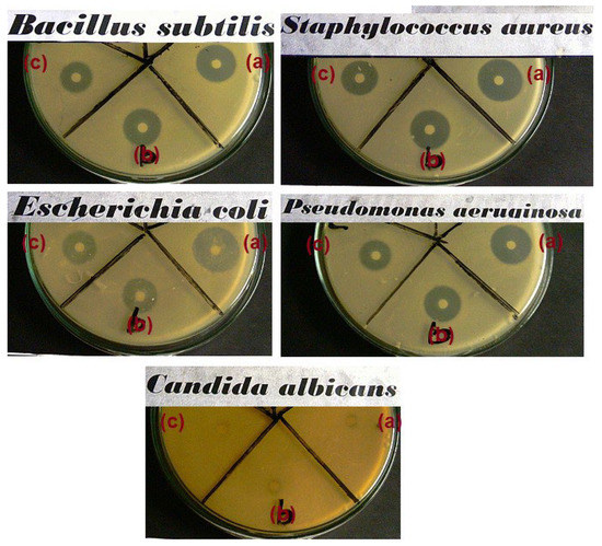 The antimicrobial activity of NC–TiO2 nanocomposites was qualitatively assessed by applying an agar well diffusion disk test against four bacterial species, Staphylococcus aureus, Bacillus subtilis as Gram (+) bacteria, Escherichia coli, Pseudomonas aeuroginosa as Gram (–) bacteria, and a yeast pathogen Candida albicans. According to this method, the nanocomposites impregnated a paper filter placed on an agar plate. After that, the bacteria were allowed to grow on the agar plate and the evaluation of the diameter of the inhibitory zones allowed to determine the efficiency of bacterial growth inhibition [41]. The pure TiO2 and two nanocomposites having different NC contents (NC20–TiO2 and NC80–TiO2) were selected for this study. The antibacterial activity of the selected samples was represented in Figure 9.