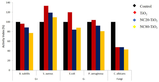 Antimicrobial activities (activity index %) for TiO2 and NC–TiO2 nanocomposites. Blank paper is added as control.