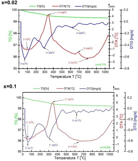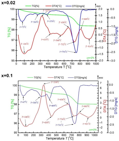 A set of thermal analysis methods (DTA, TG, DTG) was used to determine the thermal effects occurring in the tested material before synthesis. The measurement was performed in a range from room temperature to T = 1050 °C at the sample heating rate of υ = 10 °C/min. For all ceramic materials doped with praseodymium, the nature of the obtained DTA, DTG and TG curves is similar (as evidenced by Figure 1—for x = 0.02 and x = 0.1), the relationships of DTA, DTG and TG for the ceramic material modified with praseodymium ions are discussed for x = 0.02.