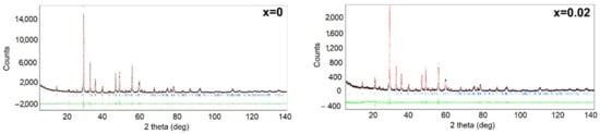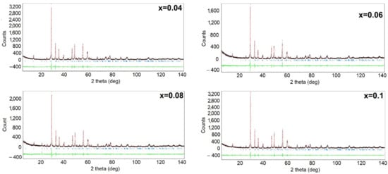 In order to determine the effect of the modifier concentration on the crystal structure of BBN ceramics, an X-ray diffraction test was performed. The first step in analyzing the obtained results was phase identification which consisted of comparing the intensity and position of the diffraction lines of the experimental diffraction pattern with the pattern from the international database. The analysis allowed us to state that the crystalline grains of the discussed ceramic materials are single-phase at room temperature. All X-ray diffraction patterns revealed diffraction lines belonging to the barium bismuth niobate (BaBi2Nb2O9) tetragonal phase—JSPDS card no 00-040-0355. Modifying the material with praseodymium ions for mole fractions x = 0.02–0.10 does not change the crystal structure of the compound, the symmetry of which can be described using the I4/mmm space group. In order to receive information from praseodymium ions addition impact on crystal structure, the lattice parameters were determined using the Rietveld method [,,]. The crystallographic data from the JSPDS card 00-040-355 were used as a starting model for the refinement. Results of the refinement are shown in Figure 3, whereas calculated values of the crystallographic parameters as well as the reliability factors determining the goodness of refinement (Rp-reliability factor of the weighted patterns, Rwp reliability factor of the patterns, Rexp—expected weighted profile factor) are summarized in Table 1. The fitting parameters Rp and Rwp are smaller than 9%, indicating that the obtained refinement results were highly reliable [].