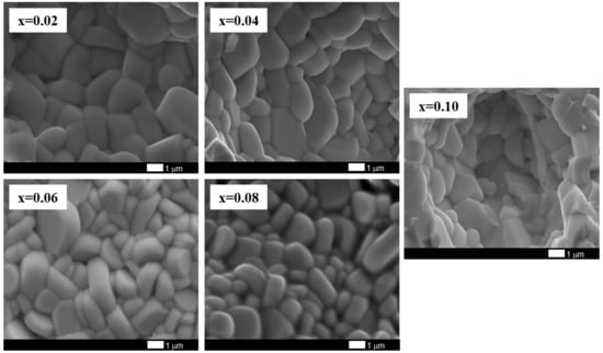 The analysis of the obtained images of the ceramic microstructure shows that the increase in the dopant content causes a slight reduction in the grain size. The base material and materials containing praseodymium with a concentration lower than x = 0.06 are characterized by an angular grain shape and emphasized grain boundaries. Starting from the concentration x = 0.06, the grains become rounder and elongate mainly along the Y-axis, assuming a shape much more similar to the plates. Moreover, their growth is layered, which is visible for samples containing Pr3+ admixture at concentrations x = 0.08 and x = 0.10. This is a characteristic feature of the morphology of materials belonging to the Aurivillius family in which bismuth layers play a significant role []. The presented SEM images of the microstructure of the tested material indicate that the increase in the concentration of Pr3+ ions causes a slight grain grinding, which increases their homogeneity. It is also worth noting that with the content of praseodymium ions x = 0.10, there is a change like cracks—for lower dopant content, the cracks are intercrystalline. In contrast, for ceramics containing the highest tested modifier concentration, transcrystalline cracks appear. The average grain size for x = 0 was ca. 2 µm [], for x = 0.02–1.8 µm, for x = 0.04 was 1.7 µm, for x = 0.06 and x = 0.08 was ca. 1.5 µm, while for x = 0.1 it was ca. 1.4 µm.