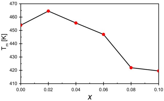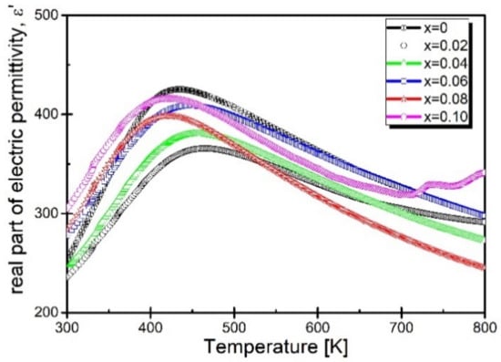 The presented temperature dependencies of electric permittivity show that the increasing concentration of praseodymium ions introduced into the sample causes a gradual increase in the value of ε at each temperature ranging from room temperature to Tm temperature, corresponding to the maximum dielectric permittivity. It is also worth mentioning that at temperatures close to room temperature, the value of the electric permittivity of each modified sample is higher than the reference sample. The tendency changes in the temperature range slightly lower than Tm—in this case, the electric permittivity value is higher than recorded for the reference sample only for the concentration x = 0.10. Moreover, what should be noted is a substantial shift of the maximum electric permittivity toward lower temperatures (Figure 6).