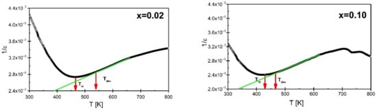 The shape of the temperature characteristics of the electric permittivity indicates a strong broadening of the phase transition, which is connected with the inability to apply the Curie–Weiss law in a wide range of temperatures above the Tm temperature. The temperature Tdev, from which the Curie–Weiss law is applied, was determined based on 1/ε′ (T) characteristic (Figure 7). The value of Tdev is strongly dependent on praseodymium concentration. Namely, at a concentration of x = 0.02 Tdev equals 561 K and gradually decreases with the increase of admixture content. For the BBN ceramics containing x = 0.10 Tdev achieves value of 485 K.