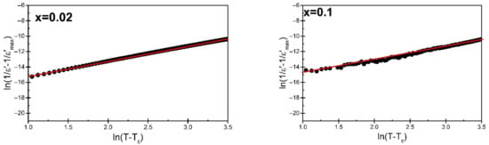 Graph of the dependence of ln (1/ε − 1/εmax) as a function of ln (T − Tm)) for BBN ceramics doped with praseodymium in the amount of x = 0.02 and x = 0.1.