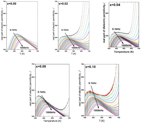 The discussed fit allowed us to determine the diffuseness parameter γ. In the case of the lowest concentration of praseodymium admixture, a rapid increase in the value of the γ diffusion parameter is observed (Table 4). For the highest amount of modifier, the γ achieved smaller values; however, it never returns to its original value for pure BBN ceramics. The same upward trend in the parameter g was also observed in the case of simultaneous doping of BBN ceramics with Cu and Ta [] ions []. This allows us to speculate that the praseodymium ions, in contrast to vanadium ones [], enhance the disorder of the crystal lattice [], which should also influence the frequency dispersion observed in the BBN ceramics. In order to investigate this issue, the temperature dependence of electric permittivity was measured in a wide frequency range of the measurement field. Figure 9 presents the characteristics of the real part of the electric permittivity component ε′ as a function of temperature, carried out for the measurement field in the range f = 0.1 kHz–1 MHz.